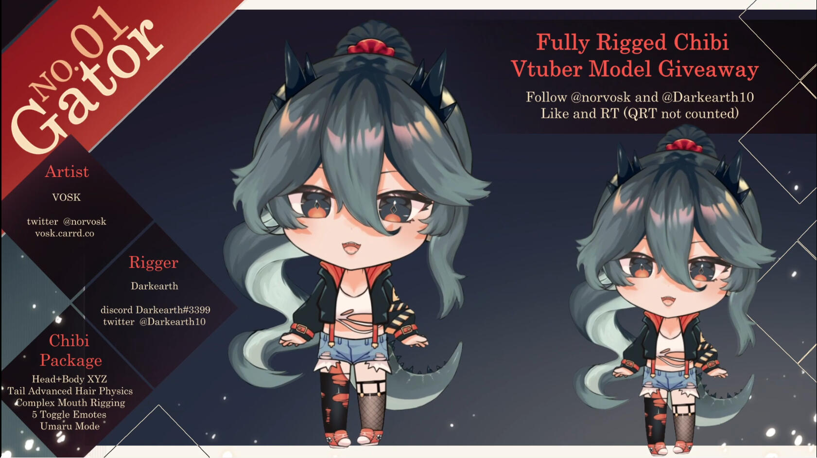 By commissioning me you agree to the following Terms of Services:REVISION POLICY- I am happy to provide as many revisions as needed if you find bugs/texture issues with your model or if something wasn't rigged correctly. You will have 90 days after your model is delivered to notify me of any changes you would like to your model. After that I may charge depending on what kind of revision you request.ARTWORK REVISION POLICYBefore I begin rigging you are responsible for verifying that you are happy with the art from your artist. Revisions made to your artwork after your model has been rigged may incur a fee based on amount of work needed to replace the layer(s). Any revisions I request from your artist will not incur a fee.DEADLINES AND DELIVERYTypical delivery on a model is between 2 and 4 weeks. This can be affected by the complexity of the model and how much work I currently have in my queue. Please verify with me if you have a hard deadline, or need the model ASAP. I do offer a rush charge of 50% if you would like to be put at the front of my commission queue and need your model done within 2 weeks.USE AND CREDITYou are welcome to use your model as you see fit, whether for private or commercial usage. You must credit me for the work on your socials/streaming platforms and anywhere you use your model. You can link to my twitter for credit. Failure to credit me for my work will subject you to paying a $300 privacy fee.Unless you tell me otherwise ahead of time I may stream work on your model or post progress pics to social media. I also post a showcase video of your model after I finish. Please tell me if you are trying to keep your model a secret and when you want to allow the video to be posted.REFUNDSIf you cancel before I begin work there will be no cost to you. If you cancel within a day of me working on your model there will be a $100 fee. At any point after that there is no refund. Many hours go into each rig and I cannot afford to refund after sinking more than a days worth of work.COMMUNICATIONI am happy to communicate through Discord/Twitter. Discord is my personal preference due to large file limits so I can more easily send you progress updates on your model. My Discord is #Darkearth, Twitter @Darkearth10, or Email [email protected]PAYMENTS